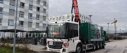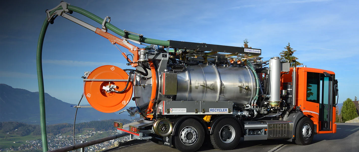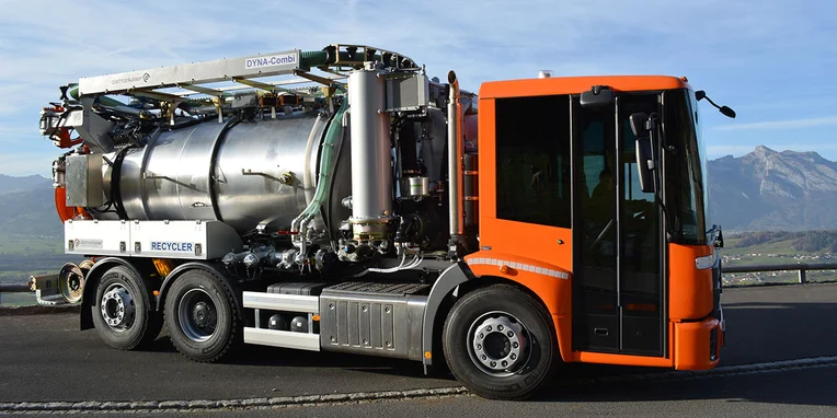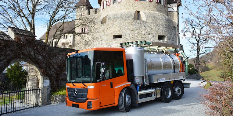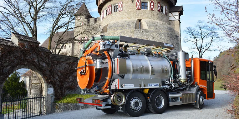 „Wir entsorgen auf einer Fläche von 300 m2 das Abwasser von 45.000 Personen“, so Markus Londer, Mitarbeiter beim WVO. Damit dies reibungslos abläuft, müssen die Kanäle und Rohre regelmäßig gespült werden. Nach der morgendlichen Einsatzbesprechung fährt Markus Londer mit seinem Econic 2635 aus und platziert diesen am Einsatzort in der Nähe des Kanaldeckels. Sein als besonders umweltfreundliches Euro-VI-Modell ausgeführtes Fahrzeug erlaubt – aufgeteilt auf seine drei Achsen, von denen eine angetrieben ist – ein höchstzulässiges Gesamtgewicht von 27 t. Auf das von der Pappas Gruppe gelieferte Fahrgestell hat die Firma Dietmar Kaiser aus Liechtenstein ein Kanalreinigungssystem mit einem 1.090 l fassenden Wassertank, einem 7.430 l großen Schlammtank sowie eine Hochdruck- und eine Vakuumpumpe aufgebaut.