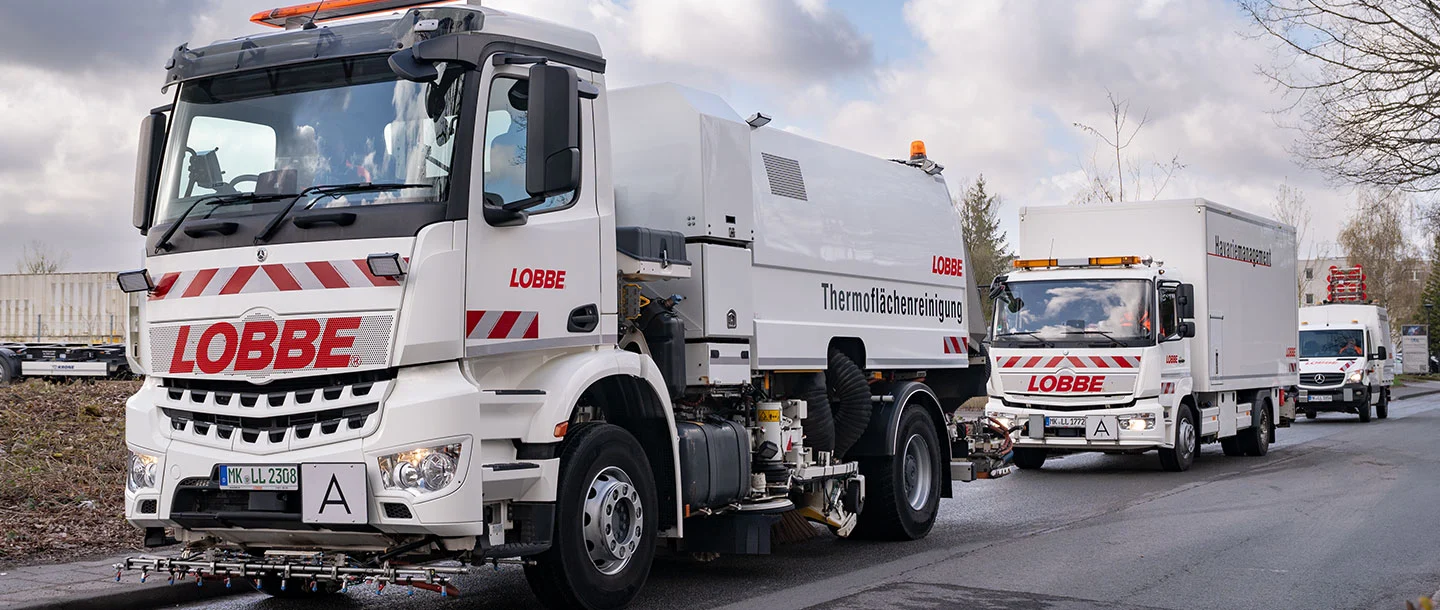 Für die Straßenreinigung und das Havarie-Management kommen zudem besonders spezialisierte Fahrzeuge hinzu. Dazu zählen Kehrmaschinen zur allgemeinen Straßenreinigung, sowie HD-Kehrmaschinen für Fräsflächen- und Baustellenreinigungen als auch Thermoflächenreinigungsmaschinen, die zur maschinellen Ölspurbeseitigung eingesetzt werden. Genau hier zeigt sich, wie eng Fahrzeug, Aufbau und Einsatz bei Lobbe zusammenspielen.