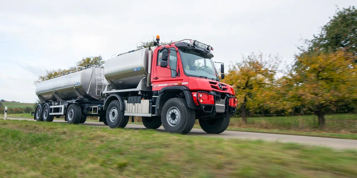 „Wir nutzen einen Tankaufbau von HLW mit ca. 7.500 l Volumen und einen Kipperaufbau mit etwa 12 m3 Volumen, der durch die Firma Eggers angepasst wurde. Außerdem verwenden wir bei Bedarf alle vorhandenen landwirtschaftlichen Anhänger auch am Unimog. Ohne die Dolly-Vorrichtung eines Schleppers sind wir hier bei weitem flexibler und wendiger, was insbesondere im Feldwegenetz entscheidend ist.“