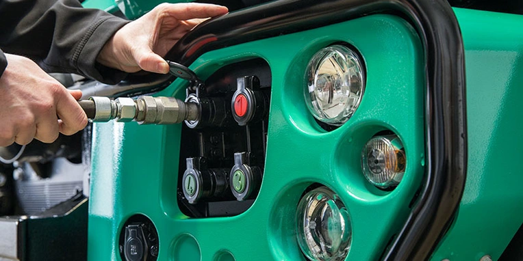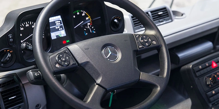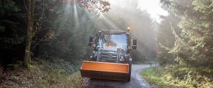 „Das erste Fahrzeug 1991 war zwar noch ein MB Trac, aber bereits 1992 kam der erste 1400er Unimog“, erinnert sich Feind. Der beste Beweis dafür steht übrigens bei ihm auf dem Hof: Beide Veteranen sind auch nach mehr als 20 Jahren noch gut in Schuss und verrichten weiterhin ihren Dienst in Feinds Unternehmen. Auf den 1400er folgten immer wieder die Vertreter der neuesten Unimog Generation, sodass der Landschaftsbau-Betrieb über eine komplette Sammlung der Unimog Modelle der vergangenen 24 Jahre verfügt. Und auch wenn ihm in dieser Zeit alle Modelle ans Herz gewachsen sind, ist der neue Unimog U 423 schon jetzt das Glanzstück in seiner Kollektion: „Durch den Hydrostat-Antrieb kann sich der Fahrer ganz auf die Arbeit mit dem jeweiligen Arbeitsgerät konzentrieren und muss sich kaum noch ums Fahren selbst kümmern. Das ist sehr bequem. Der Fahrer kann über den Lenkstockhebel, mit dem Joystick oder mit dem Gaspedal die Geschwindigkeit einstellen. Zum Arbeiten am Straßenrand wird zudem die Lenkradposition von links nach rechts gestellt. Unser Fahrer kann also aus den verschiedenen Bedienpositionen, die für ihn ergonomischste frei wählen“, sagt Feind. In diesem Zusammenhang freuen sich die Feind-Fahrer auch über ein weiteres Feature: Mit dem neuen Hydrostat ist es nicht länger nötig, für den Wechsel von Fahrbetrieb zum Gerätebetrieb anzuhalten.