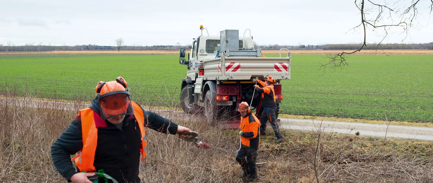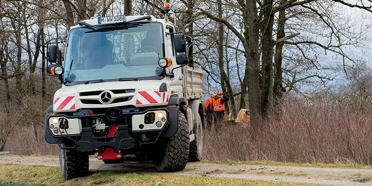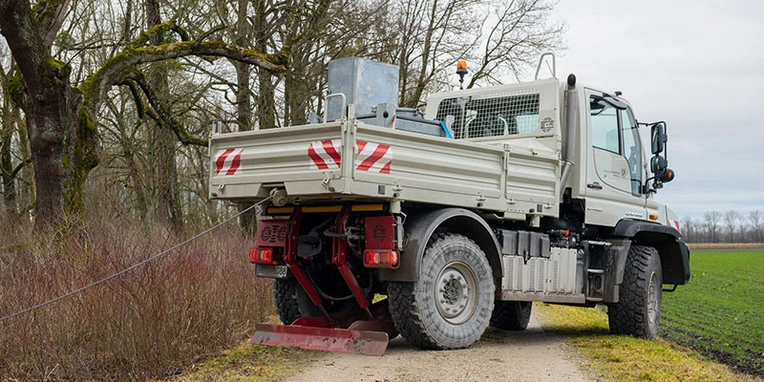 Da die Seilwinde am Heck sitzt, bleibt die Front des Unimog frei für häufig genutzte Anbaugeräte, etwa Mulcher oder Mähgerät. Die werden von der Flussmeisterstelle regelmäßig für Schnitt-, Trimm- und Arbeiten an den Hängen der Wasserwege verwendet. „Da arbeitet es sich im Hydrostatbetrieb mit dem neuen U 430 unkompliziert. Durch den Joystick an der Beifahrerseite ist Schneiden und Mähen einfacher als im Vorgänger.“ Seine Vielseitigkeit beweist der Unimog, weil die Landschaftspfleger ihn als Zugfahrzeug vor einem Tieflader einsetzen, mit dem sie ihren Bagger zu den Einsätzen transportieren – die ideale Kombination aus Arbeitsmaschine und Zugpferd. Neben dieser Flexibilität war die Umweltzonen-Konformität für den Neukauf ausschlaggebend. Denn der U 430 in Euro VI lässt sich auch in Münchens Innenstadt einsetzen.
