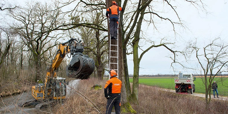 Nun ist Klaus an der Reihe – er dirigiert die Seilwindenhydraulik mit der Forstfunkanlage und steht so außerhalb des Gefahrenbereiches. Der Stamm ächzt, bis er schließlich unter Knirschen knickt und wie erwartet übers Wasser fällt. Dann wird das 90-Meter-Seil hydraulisch eingezogen. Eine Seileinlaufbremse sorgt für straffes Aufrollen, damit sich das Seil beim nächsten Mal leicht ausziehen lässt. Die Seilwinde wird in eine spezielle Dreiseitenkipppritsche integriert. Der Rahmen der Pritsche passt direkt auf die vorgesehenen Aufbaupunkte des Unimog. Sofern die Seilwinde nicht „auf Zug“ arbeitet, kann die Pritsche uneingeschränkt verwendet werden.