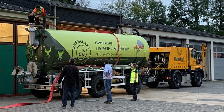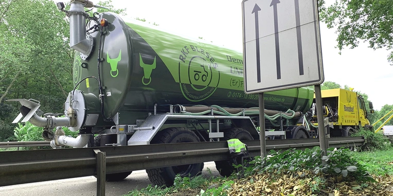 Die Herausforderung bestand darin, die 50 Bäume möglichst „in einem Aufguss“ mit dem lebensspendenden Nass zu versorgen, denn die Sperrung eines Standstreifens ist eine kostenintensive Angelegenheit. Mit dem vorhandenen 4.000-l-Tank des Unimog ging die Rechnung nicht auf, da jede der Platanen rund 500 l Wasser benötigt. Die Lösung fand sich in einem Gülleanhänger der Firma RKF-Bleses GmbH. Der Unimog Partner stellte dem Gartenbaubetrieb dieses Vorführfahrzeug kostenlos zur Verfügung und es wurde für diesen Spezialauftrag umfunktioniert.