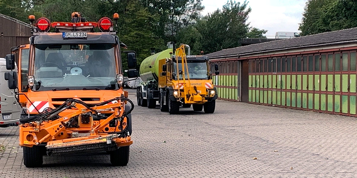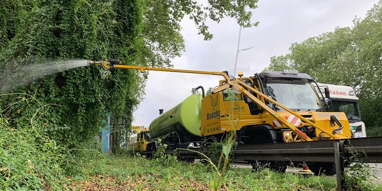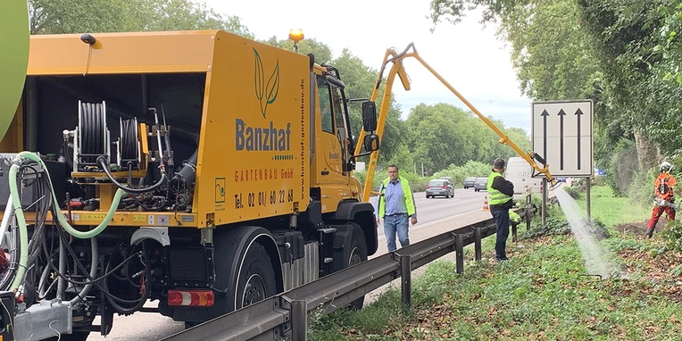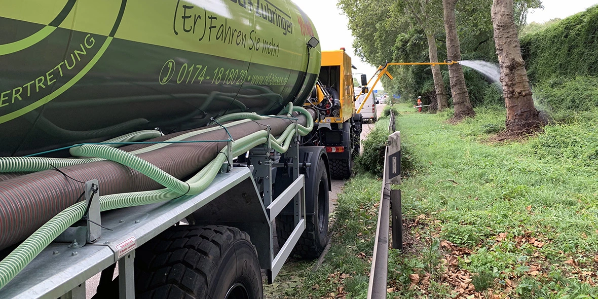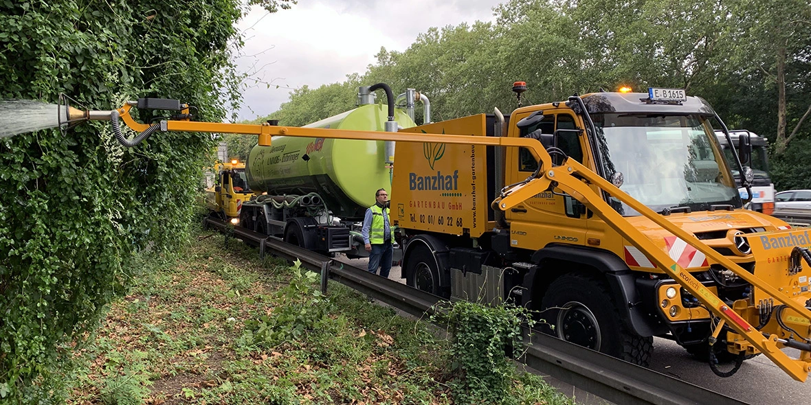 Die außergewöhnlich trockenen Sommer der letzten Jahre stellen die Kommunen vor besondere Herausforderungen, was den Erhalt der Pflanzenwelt betrifft – so auch im Fall dieses „Überraschungsauftrags“, wie ihn Christian Weinert, Geschäftsführer der Firma Banzhaf, beschreibt. An der ältesten deutschen Autobahn A 555, die 1932 durch den Kölner Oberbürgermeister Konrad Adenauer eingeweiht wurde, stehen zahlreiche Platanen. Zwar haben diese Bäume tiefe Wurzeln, doch die Dürreperiode machte ihnen so sehr zu schaffen, dass eine schnelle und effiziente Lösung gefunden werden musste. Über einen Baumpfleger, der für die Autobahnmeisterei Köln arbeitet, wurde der Kontakt mit der Gartenbau-Firma in Essen hergestellt. Christian Weinert kann heute zufrieden resümieren: „Das war ein wirklich verzwickter Auftrag, aber mit dem Unimog haben wir es geschafft.“