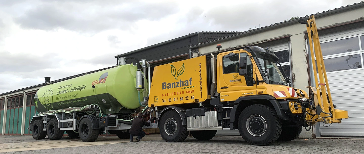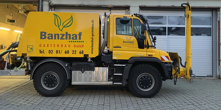 Einen solch heißen Sommer haben die Mitarbeiter der Banzhaf Gartenbau GmbH in Essen noch nie erlebt – obwohl sie sich schon seit 1987 um das Wohl der Vegetation kümmern. Die 30 Mitarbeiter sind im gewerblichen und kommunalen Bereich im Einsatz. Stets mit dabei sind ihre zuverlässigen Fuhrparkmitglieder von Mercedes-Benz: Ein Arocs und zwei Sprinter dienen als Pritschenfahrzeuge. Im April 2020 wurde zudem ein Unimog U 430 als Bewässerungsfahrzeug angeschafft. Die Dienste des orangenfarbenen Gartenhelfers waren sofort überraschend gefragt.