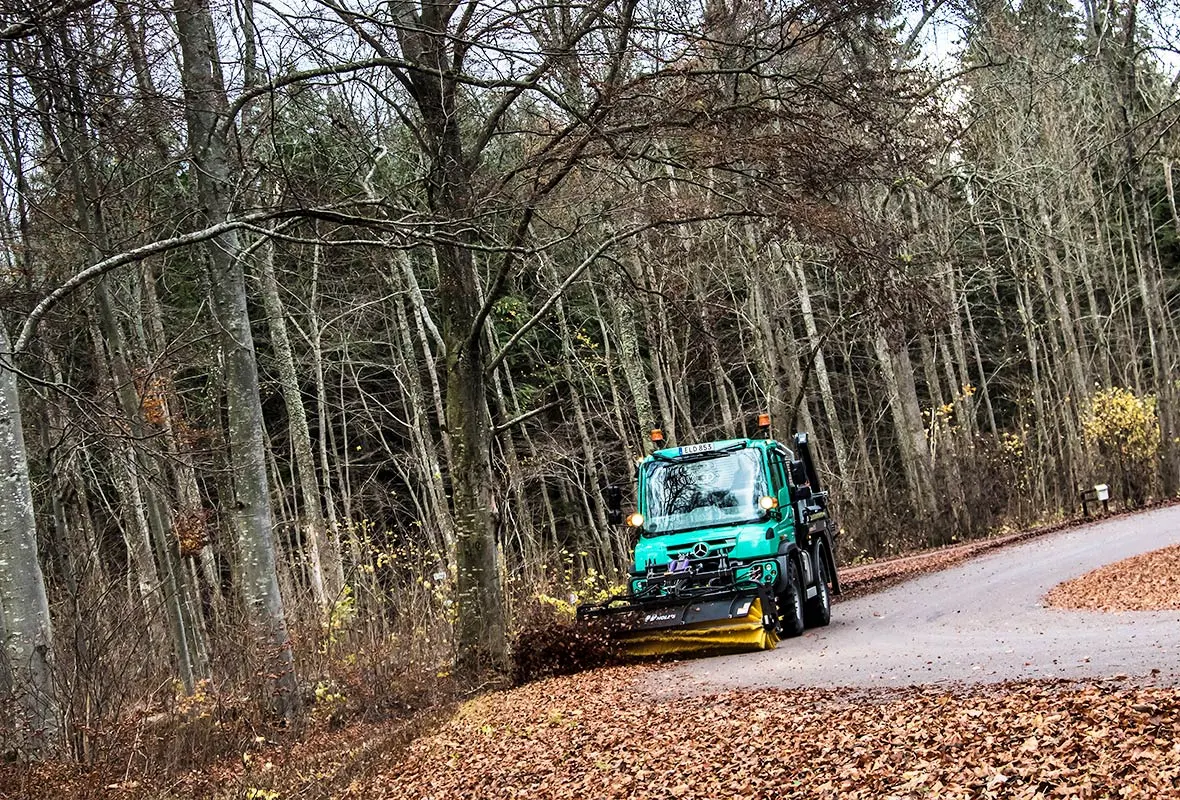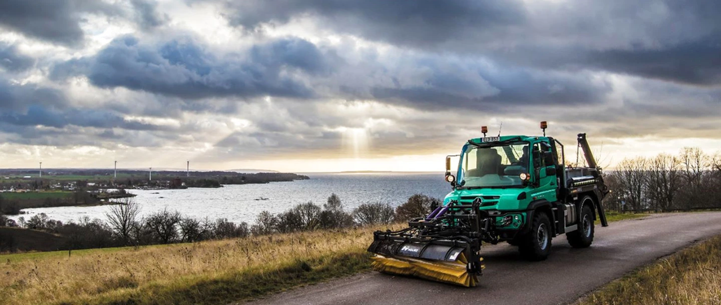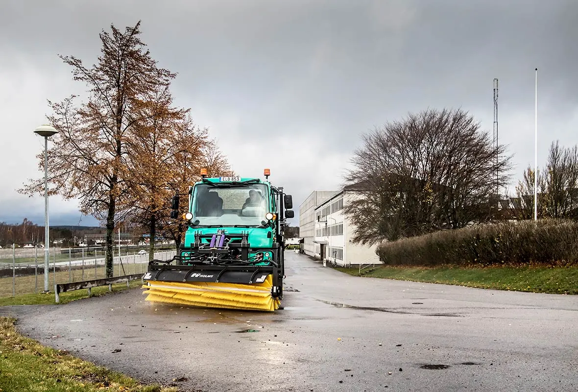 „Dank der großen Panorama-Frontscheibe hat man eine sehr gute Sicht nach vorne“, sagt Bengt Alvinsson. „Das kommt uns im Einsatz natürlich zugute.“ Auch die Flexibilität des Unimog mit seinen verschiedenen hydraulischen Anbauplätzen spielt dem schwedischen Unternehmer gut in die Karten. „Wir setzen unsere Fahrzeuge vor allem bei der Grünflächenpflege und im Winter- und Sommerdienst auf den Straßen ein. Dabei werden unterschiedlichste Geräte benötigt, wie beispielsweise ein Mäher für das Schneiden von Gras oder eine Holms Vorbaukehrmaschine für die Straßenreinigung. Deshalb profitieren wir sehr von dem einfachen Wechsel zwischen verschiedenen Anbaugeräten“, meint Bengt Alvinsson.