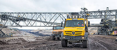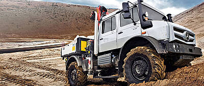 Der Unimog U 4023/U 5023 bringt Mannschaft, Material und schweres Gerät an die entlegensten Einsatzorte - ideal um Sturmschäden zu prüfen, Kabel zu verlegen oder Wartungsarbeiten durchzuführen. Ob Sand, Geröll, Matsch oder Schnee, das hochgeländegängige Fahrzeug meistert jedes Terrain. Allradantrieb, Single-Bereifung, die Reifendruck-Regelanlage TireControl plus und Differenzialsperren sorgen für maximale Traktion abseits der Straßen. Vor allem seine Bodenfreiheit von bis zu einem halben Meter kommt dem Unimog im Gelände zugute.
