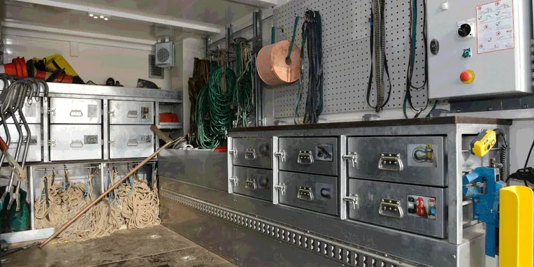 Schneiders Team ist bei der Arbeit – auf dem stählernen Masten einer 63.000-V-Starkstromleitung, der von mannshohem Schilf umgeben ist. Eine Traum-Umgebung für den Unimog. Regelmäßig wird das Gebiet vom Fluss Ill überflutet, was die Zufahrt noch anspruchsvoller macht. Schneisen werden benötigt, um überhaupt Einsatzteams in den „Großen Ried“ zu bringen. „Die Kollegen anderer Teams haben allradgetriebene Lkw bekommen, mit denen sie sich nicht in ein solches Gelände wagen“, so Schneider. Daraus ergeben sich entscheidende Nachteile, beispielsweise in der Bereitstellung von Werkzeugen und Arbeitsgeräten, die sich nicht per Pick-up transportieren lassen.