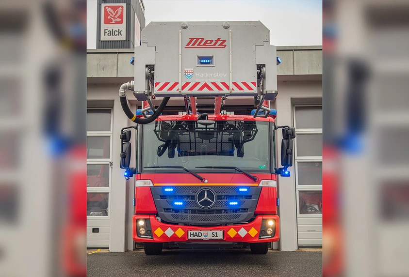 An zwei Orten wollen Højland und Fredskild den Econic und den Drehleiteraufbau von Metz heute ausprobieren. Die erste Station ist ein alter Getreidesilo am Haderslev Fjord, der zu einer Kletterwand umgebaut wurde. Es dauert nur wenige Minuten, und die Leiter ist auf die passende Höhe ausgefahren. Sie lässt sich sowohl von einem Steuerungssitz auf dem Chassis als auch vom Korb aus bedienen. „Metz ist seit Jahrzehnten der Mercedes unter den Drehleitern“, sagt Karsten Højland. „Alles ist Qualitätsarbeit und funktioniert auf Knopfdruck.“