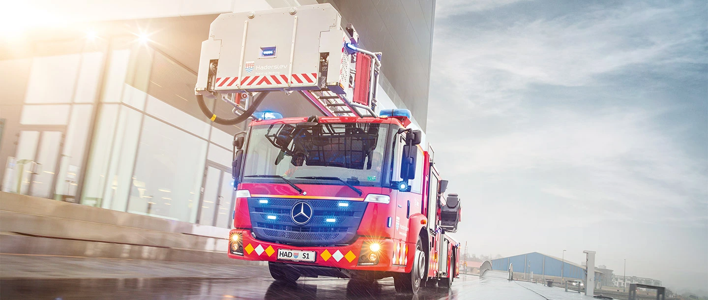 Es gibt kein besseres Basisfahrzeug für eine Drehleiter als den Econic“, sagt Karsten Højland. „Die niedrige Bauhöhe lässt Platz für die mächtige Drehleiter über dem Dach. Das Low-Entry-Konzept gewährleistet einen niedrigen Einstieg. Das geht schnell und bequem. Und der geräumige Innenraum hat Platz für zwei Feuerwehrleute plus Ausrüstung.“ AuchJens Fredskild, der heute am Steuer sitzt, ist Econic- Fan: „Die neuen Euro VI-Motoren bieten bei niedriger Drehzahl ein hohes Drehmoment, sodass wir schnell vom Fleck kommen. Zusammen mit dem vollautomatisierten Allison-Getriebe erzeugen sie genau die Fahrdynamik, die wir im Notfall brauchen."