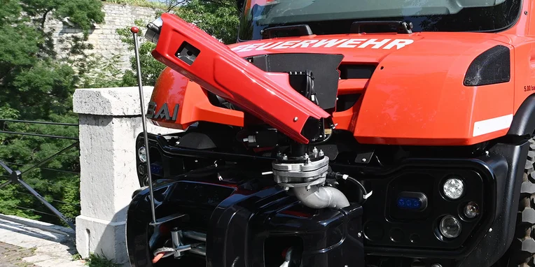 Der an der vorderen Stoßstange angebrachte Frontmonitor liefert bis zu 400 l/min. Der bis zu 180° drehbare Wasserwerfer kann über einen Joystick direkt aus dem Fahrerhaus bedient werden.