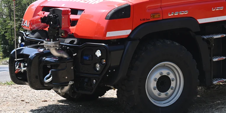 Die Löschsysteme an Bord des Unimog sind sowohl für die klassische Brandbekämpfung als auch für die besonderen Anforderungen im Gelände ausgelegt. Die zweistufige Wasserpumpe von Godiva kann sowohl mit 10 bar als auch mit 40 bar Wasserdruck arbeiten. Sie versorgt gleichzeitig das Selbstschutzsystem des Löschfahrzeugs mit Wasser: Dessen sechs Düsen schützen die Vorder- und Hinterräder des Unimog vor Hitze und Flammen bei Bränden im Gelände. Ein Hochdruck-Schauminduktor zur Herstellung von Löschschaum ist ebenfalls mit an Bord.