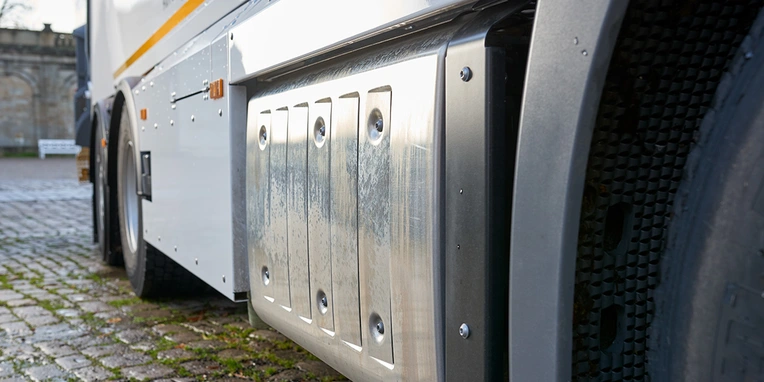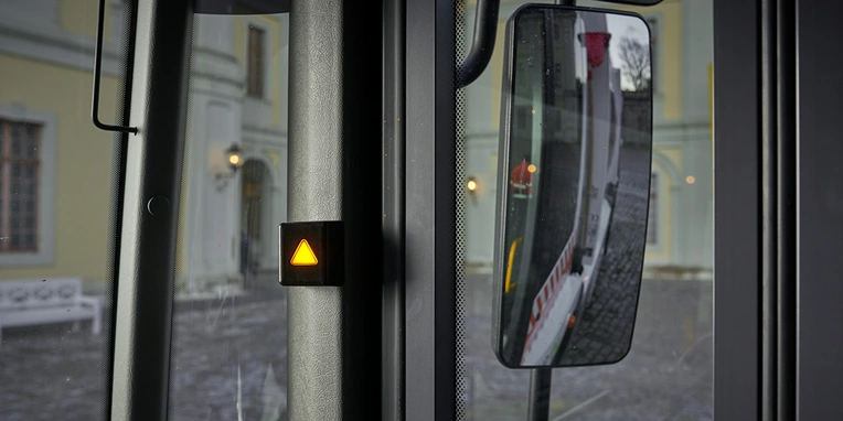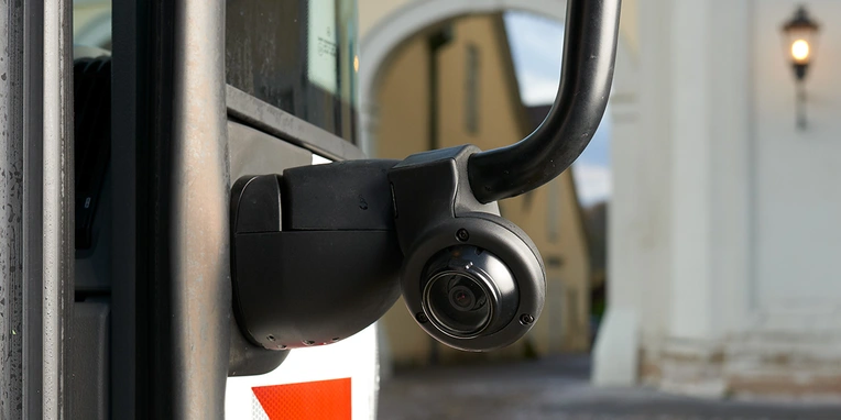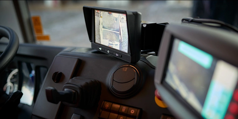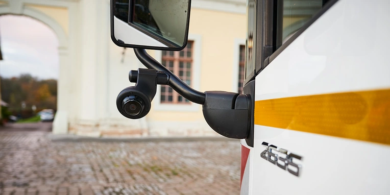 In den neuen Econic Lkw von SUEZ und Mercedes-Benz sitzen die Fahrer praktisch auf Augenhöhe mit Fußgängern und Radfahrern. Durch die tiefgezogene Panoramascheibe und die bodentiefe Verglasung auf der Beifahrerseite (High Visibility Fahrerhaus) hat der Fahrer eine herausragende Sicht. Dies erhöht die Sicherheit für schwächere Verkehrsteilnehmer vor und neben dem Fahrzeug. Der eingebaute Abbiege-Assistent warnt den Fahrer frühzeitig, sobald sich eine Person in die Warnzone bewegt. Diese erstreckt sich über die gesamte Länge auf der rechten Seite des Fahrzeugs. Dort ist der tote Winkel besonders groß.