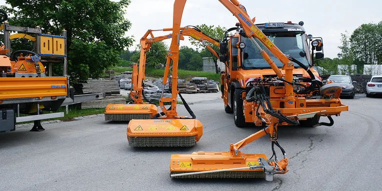 „Kombiniert mit dem MFK 500 ist der Unimog U 218 der ideale Einstieg in die günstige und professionelle Straßenunterhaltung“, brachte Verkaufsberater Jürgen Rieger seine Erfahrungen auf den Punkt. Der Frontausleger kann grundsätzlich im Rechts- und Linksbetrieb eingesetzt werden. Praktisch: Mit der integrierten Querverschiebung lassen sich Bäume oder Schilder einfach und sicher umfahren.