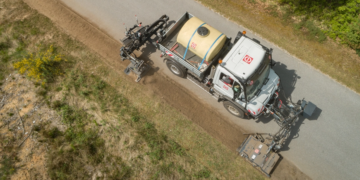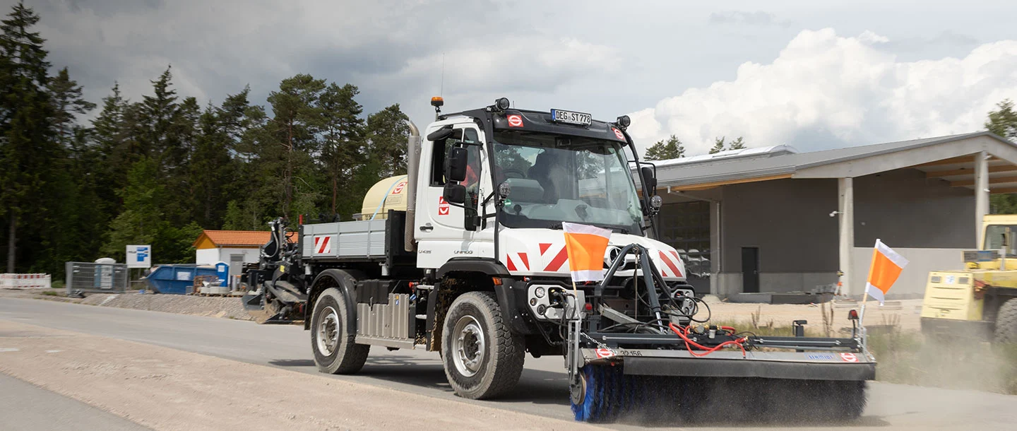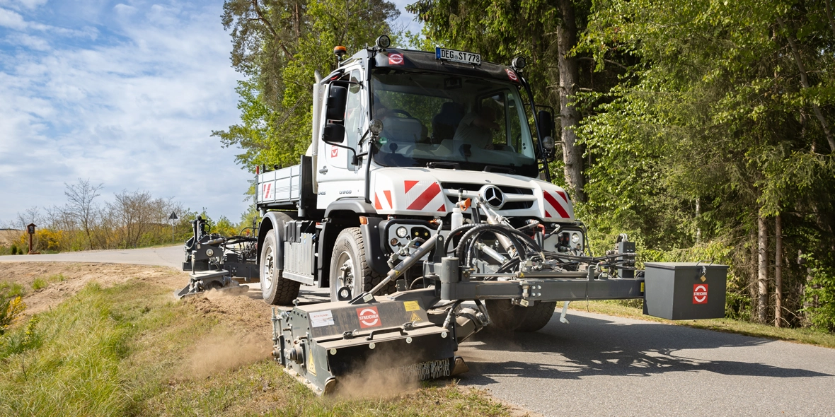 So rasant die wilde Fahrt in den „Major Rides“ und „Wellenfliegern“ der Unternehmensmarke Zierer ist, so bodenständig und fast schon zeitlupenmäßig geht es bei den Kollegen der Niederlassung in Waldmünchen zu. Hier kümmern sich die Mitarbeiter um Rohrleitungs- und Wegebau. Und genau dort kommt der Unimog U 435 ins Spiel, wie Hans-Jürgen Schwarzbauer erklärt: „Für öffentliche Auftraggeber verlegen wir Leitungen und Rohre entlang der Straßen. Dafür wird per ferngesteuertem Spezialpflug die Bankette aufgepflügt und in 80 bis 100 cm Tiefe das Medium verlegt. Um die Bankette ordnungsgemäß und nach Richtlinien wiederherzustellen, benötigen wir den wendigen Unimog, mit dem wir in einem Arbeitsschritt verdichten und kehren.“ Wenn es sein muss, kann auch noch zeitgleich gefräst werden. Ein hydrostatischer Antrieb und die Wechsellenkung VarioPilot® sind hierfür unerlässlich.