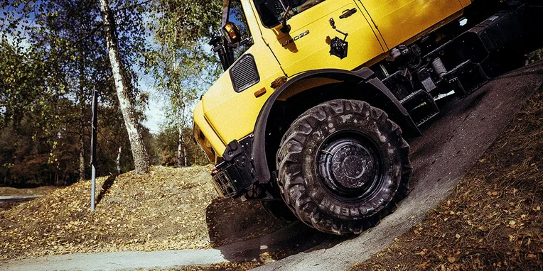 Steinige Wege, die man nicht einmal zu Fuß bestreiten würde, sind für den Gelände-Profi eine Spazierfahrt. Rutschige Treppen mit einer Steigung von 60 Prozent bezwingt der 230 PS starke Unimog mit Leichtigkeit – auf- und abwärts. Da kommen selbst abgebrühte PS-Profis am Steuer ins Schwärmen. Gräben mit einer Wassertiefe von 1,20 m durchfährt der Unimog dank seines höhergelegten Ansaugkamins und der wassergeschützten Aggregate widerstandslos.