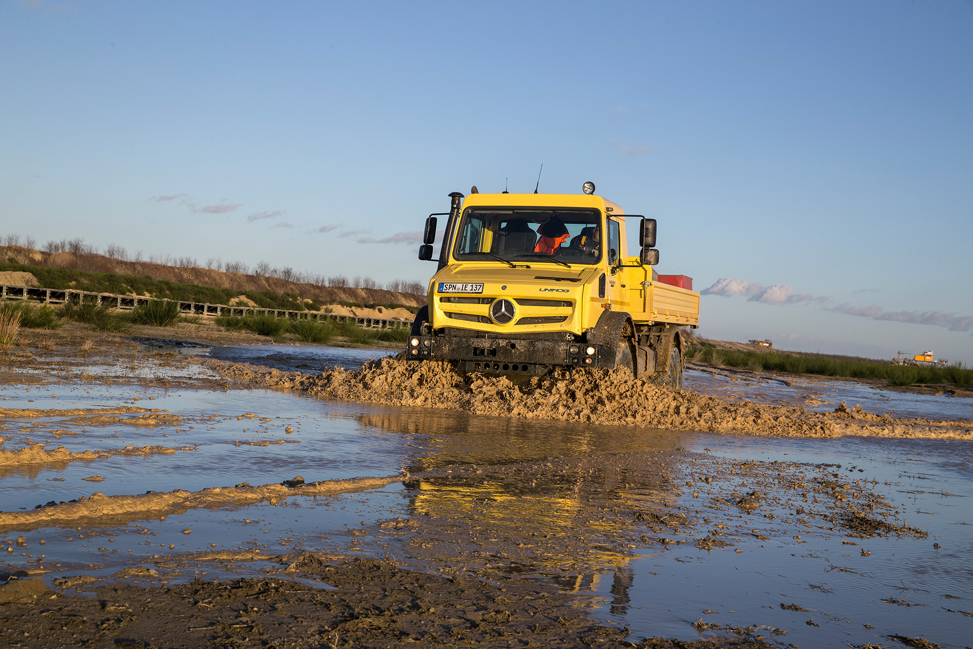 Insbesondere der hochgeländegängige Unimog überzeugt offroad. Zum Beispiel durch Differenzialsperren, hohe Verwindungsfähigkeit und Portalachsen.