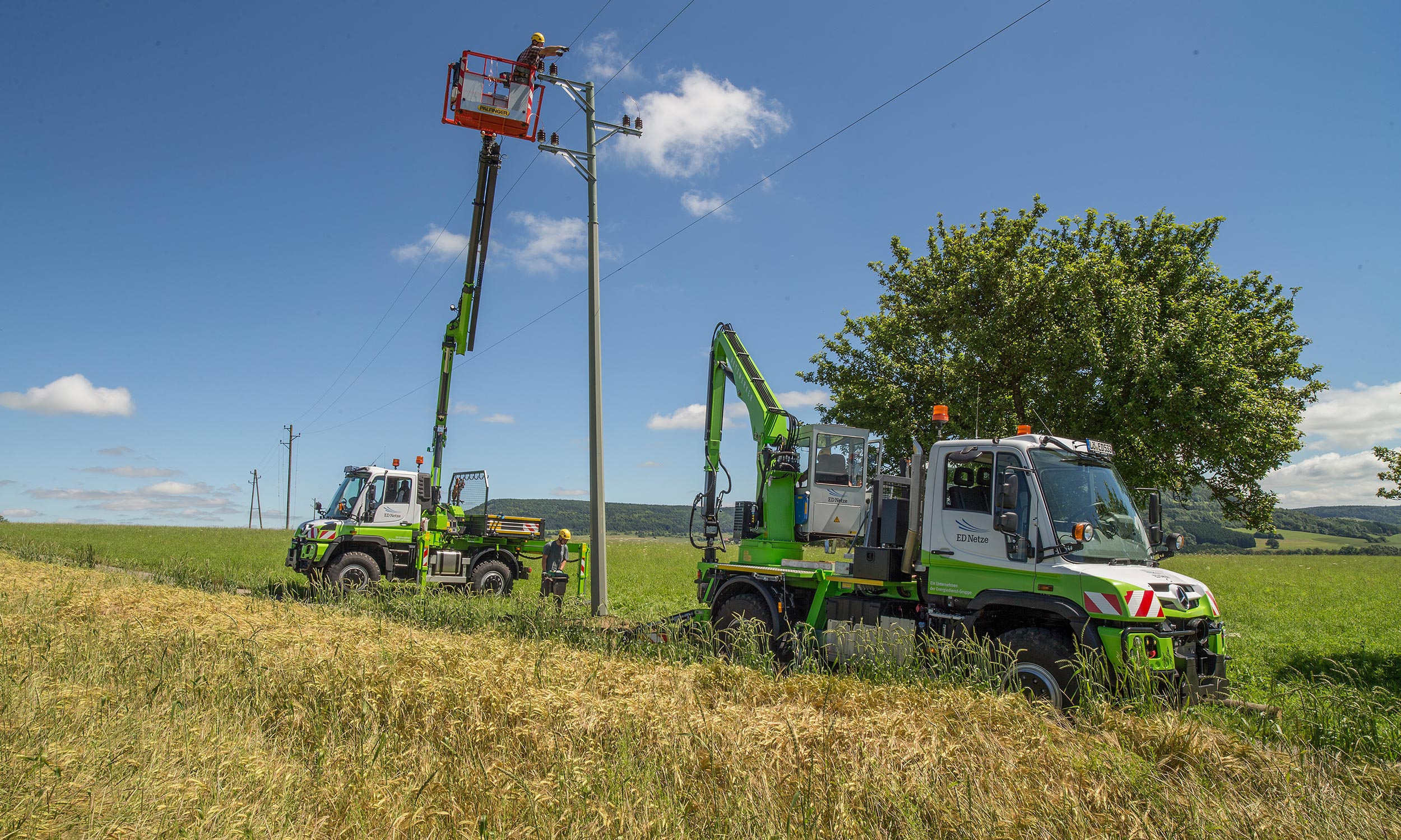 Betreiber ED Netze setzt Unimog ein, um Freileitungsmonteure in luftige Höhen zu bringen, morsche Masten zu entfernen, tiefe Löcher zu graben und neue Kompositmasten zu stellen.