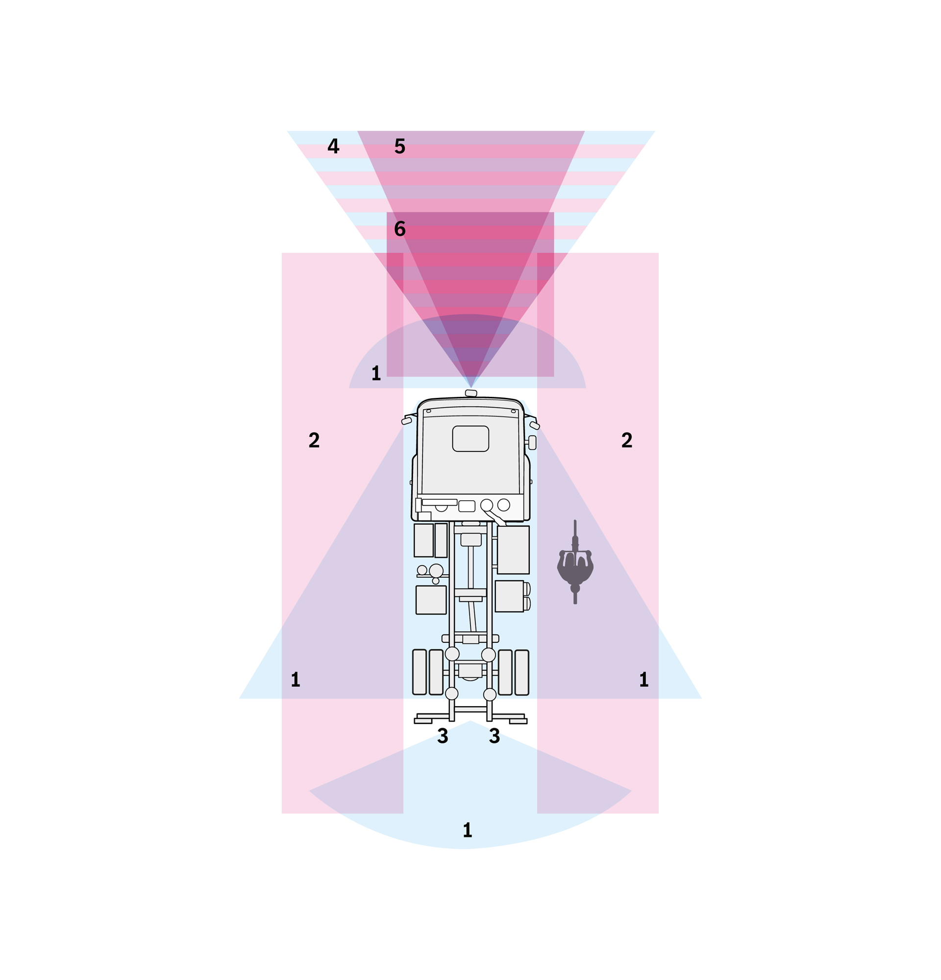 Frontguard Assist monitors the traffic area immediately in front of the Econic and supports the driver in the speed range up to 15 km/h. If the system registers moving objects such as people right in front of the vehicle with its camera and radar sensor, it can issue a two-stage hazard warning and prevent serious accidents.