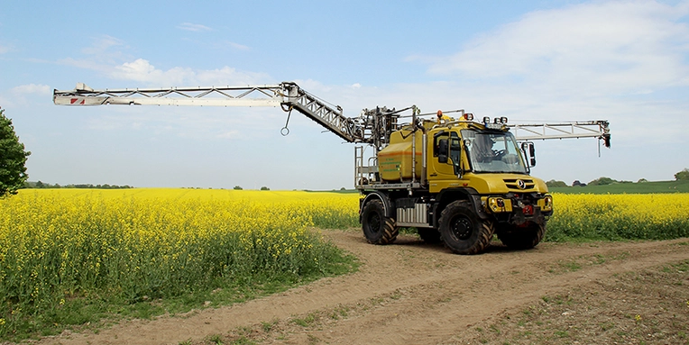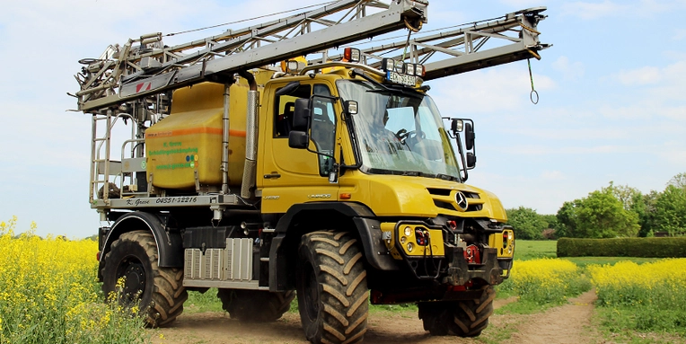 The current backbone of the business is a state-of-the-art Unimog U 530 – the third Unimog from the implement carrier series to perform that role. A Dammann crop sprayer is mounted on it to carry out the main work duties. The sprayer has a 3,000 litre capacity, and can work at widths from 24 to 30 metres. That enables Greve to meet a wide variety of different customer wishes. The state-of-the-art GPS control permits high-precision spraying. Special sensors ensure that the bar is kept at exactly the right height. Some 5,000 hectares are treated in this way every year.