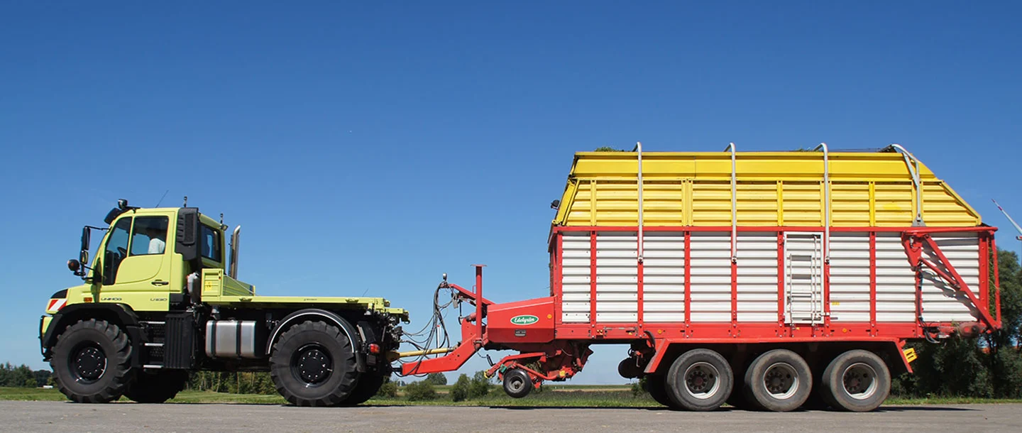Thanks to its generously dimensioned high-traction tyres, tyre pressure control system and raised transport capacity, the Unimog is an impressive vehicle for use both on fields and on the road. The articulated steering on the trailer ensures that the combination remains manoeuvrable and keeps to its track behind the Unimog even on tight paths.
