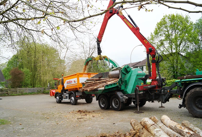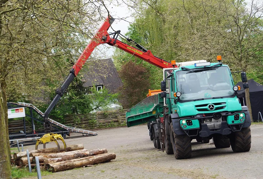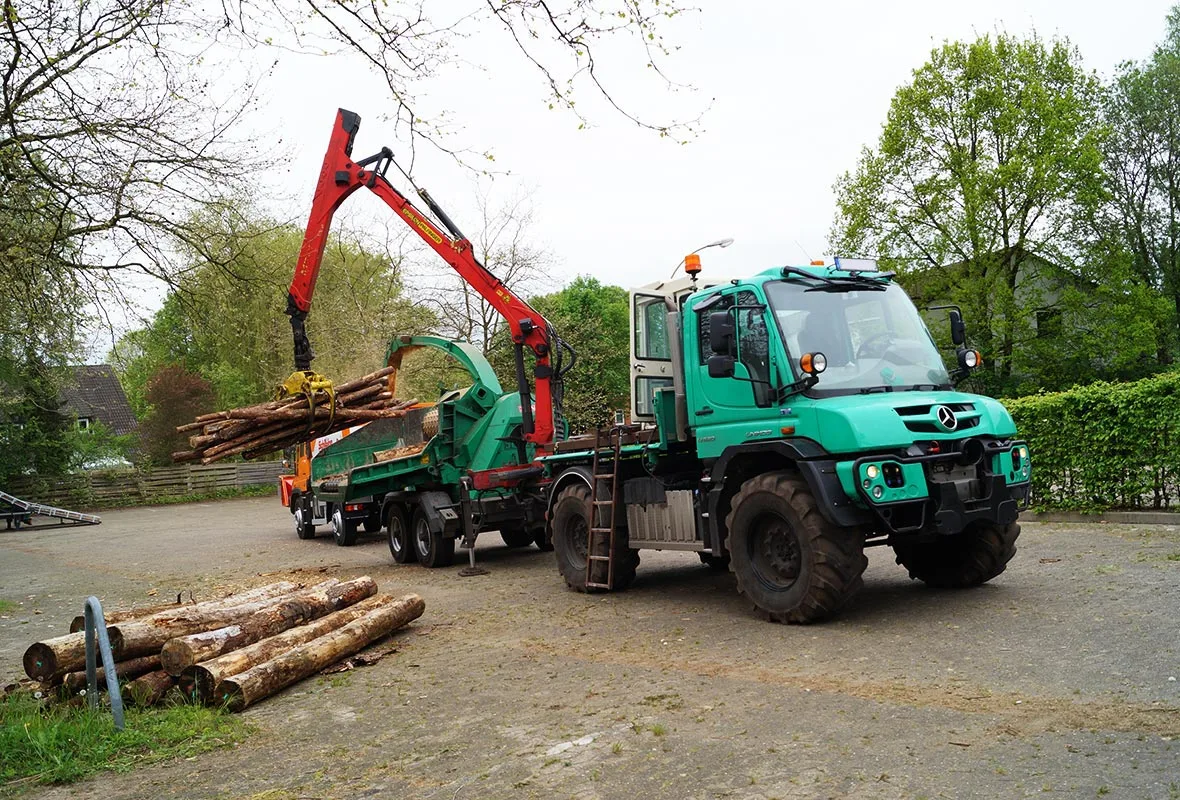 Sascha Voß uses the power of the Unimog to drive what he describes as a "massive chipper": a HEM 581 manufactured by Jenz, which reduces tree trunks with a diameter of up to 65 cm to something resembling spillikins. Sascha Voß sits in the cab of his crane, which is mounted on the Unimog, and uses the grabber to manoeuvre several tree trunks at once in to the chipper's "mouth".