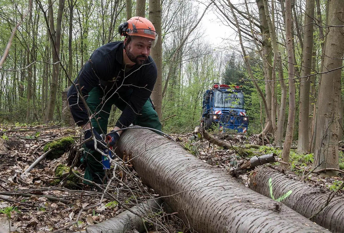 Stefan Schatz stands well outside the danger zone with his radio remote control. He skilfully deploys the crane, and positions the gripper just below the crown of the tree. With a brief tap of the button on the remote control, the chain saw deploys and neatly separates the crown from the trunk. Schatz swings the cutting away, and expertly places it on the chipper conveyor. Now, if not before, we know why the thoughtful landscaper has provided us with earplugs. The chipper is as loud as it is efficient. A few more skilful crane movements, the noisepeaks a few more times – and the over 15 metre high tree is history.