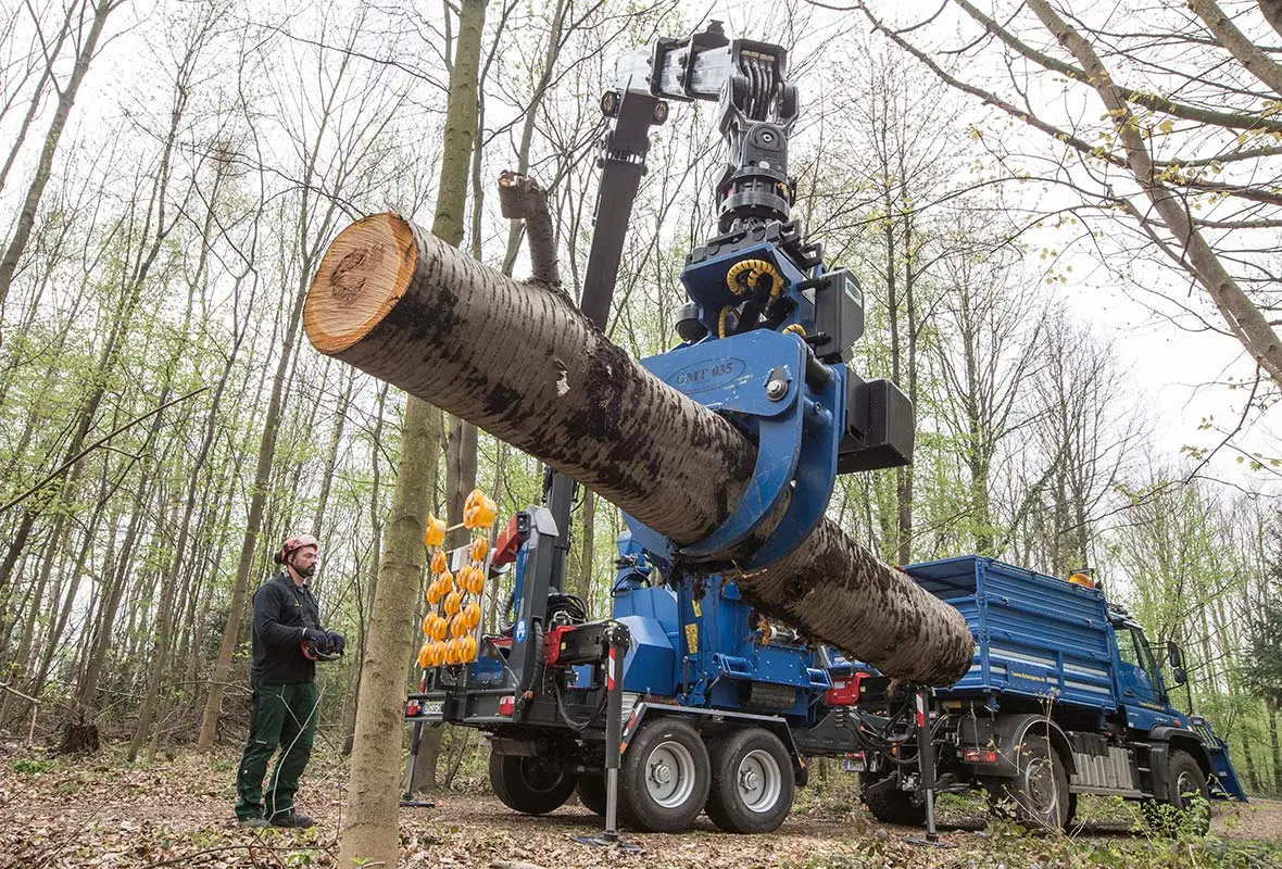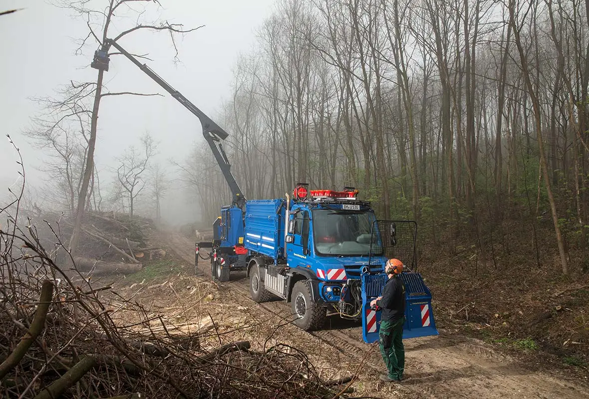 The creative landscaper demonstrates exactly what he means through his use of the U 530. One of today's jobs is cutting the wide green strip between a forest track and a busy main road, and chopping down a number of leaning trees that are threatening to fall on the road. To do the job, Schatz hitches a sturdy trailer to the Unimog, combining a woodchipper and a short timber crane, complete with a tree-gripper and saw. The chipper drum needs enormous drive power, because its feed roller handles tree trunks up to 50 centimetres in diameter, which are then chopped into finger-sized chips. It draws its power from the Unimog's power take-off shaft. The crane hydraulics are operated by the hydraulic unit installed in the U 530.