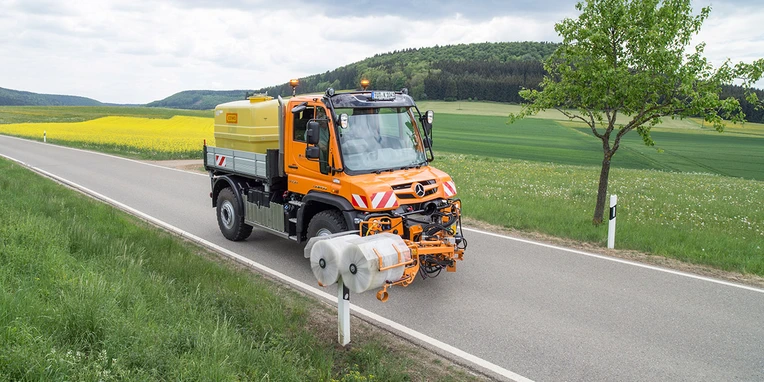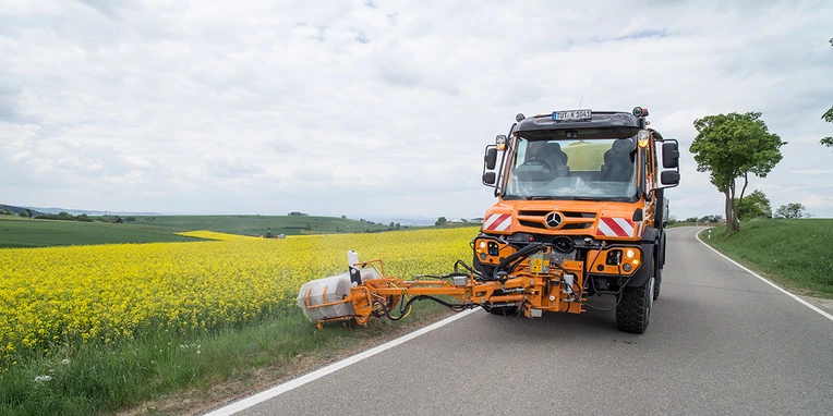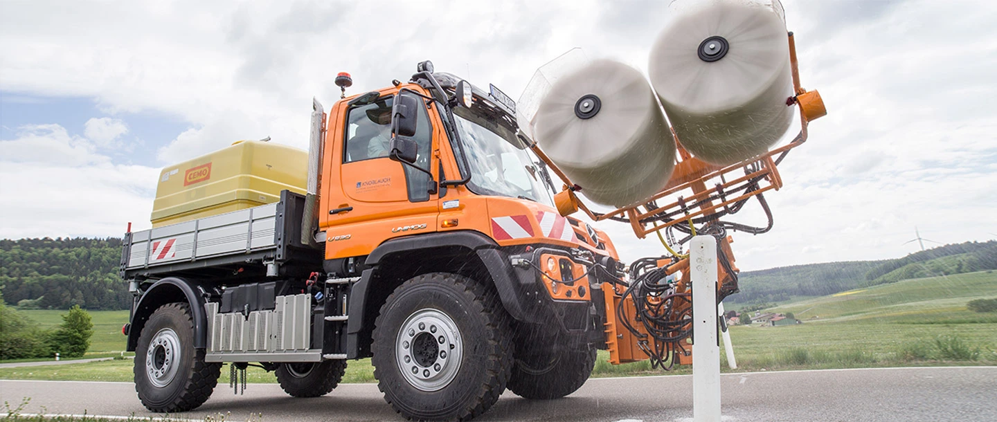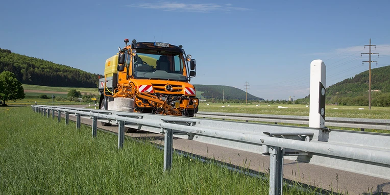 They appear every 50 m on both sides along the streets. On the left they are marked with two dots, on the right with a white stripe. They are indispensable for road safety: guide posts not only serve to define the carriageway but also help to identify the course of the route, especially in darkness and fog. Regular inspection and cleaning is therefore crucial to road safety. In Baden-Württemberg, Germany, this responsible task is taken on by a Mercedes-Benz Special Truck: the Unimog U 530.