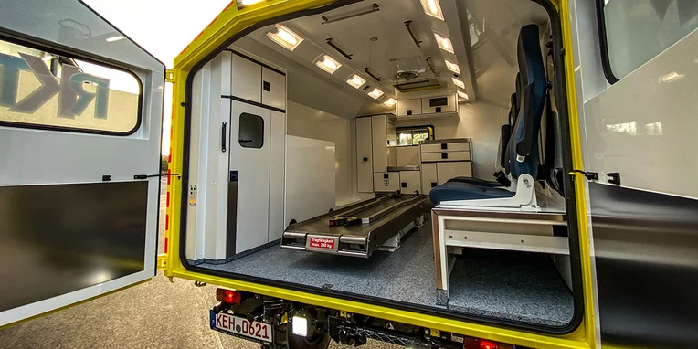 The second model, with a Rosenbauer body, is a U 1300L (call sign: “Regensburg Rescue 53/1”) which originally came from colleagues in the Austrian disaster relief service and is used by the technical operations group. On board, it has three emergency power generators, two lighting sets, a 16 t lever hoist, a tent with its own heating system, field beds, a litter, a heavy-duty toolkit, chain saw, tensioning straps and an emergency medical kit.