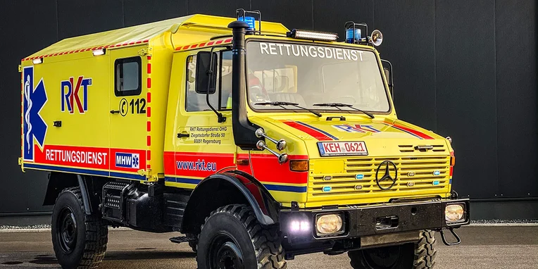 One Unimog was a former military ambulance acquired from the German army and converted into an extreme off-road civilian emergency vehicle compliant with all DIN specifications (call sign: “Regensburg Rescue 71/72”). Its special equipment includes additional lighting at the front from a 600 W LED light bar, two 120 W LED reversing lamps and another two 75 W lamps, LED surround lighting, air intake snorkel, roof hatch, Hänsch LED beacons, 8 LED front strobes, horn siren system and an additional foghorn as a vehicle horn.