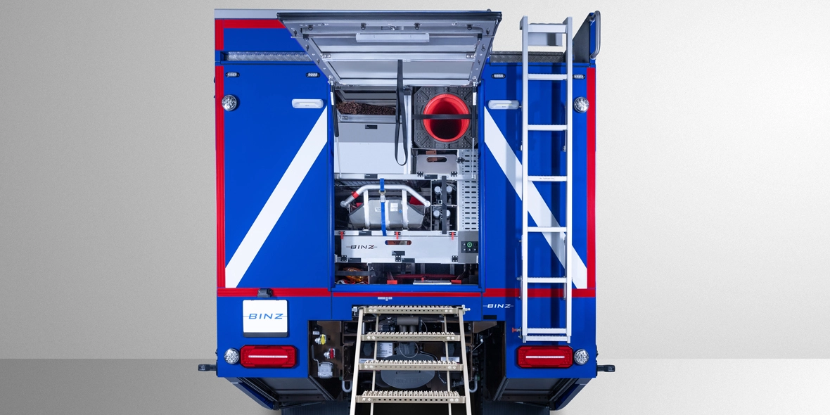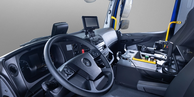 The Mercedes-Benz Atego 1530 AF 4×4 is a carrier vehicle with a 6-cylinder diesel engine and an output of 220 kW (299 hp). All-wheel drive, locks and 800 mm fording all help keep the vehicle moving safely off-road. With this equipment, the permissible gross vehicle weight is 16 t with a payload of over 3.6 t. With its twin-tyred rear axle, the vehicle offers better traction and more even weight distribution. For challenging operations such as recovery, a hydraulic cable winch with 50 kN of tractive force is installed forwards. Clever deflection doubles the power of the winch to the rear to 100 kN with 25 m of cable.