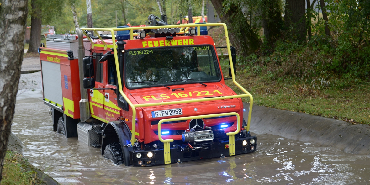 The high level of heat shielding installed in the two Unimog vehicles ex works makes the fire service more resilient in operation, while the TireControl plus tire pressure control system gives crews more control. In addition, the RW-HG offers greater maneuverability in flooded terrain and a fording capability of up to 1.2 m, which gives the emergency services more freedom when tackling situations involving water. After all, the extreme off-road Unimog must be able to follow the TLF-W without any issues, even in floods. And this is not necessarily only the case within Stuttgart's city limits, because, from time to time, the fire service provides support beyond regional and national borders – from the Ahr valley to Greece.