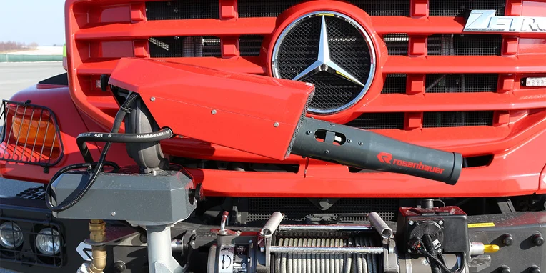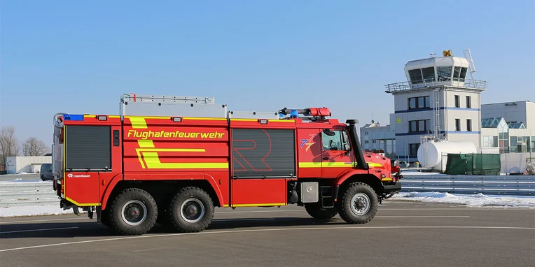 When searching for a successor to the old Mercedes-Benz 1113 short-bonnet truck to guarantee the safety of aircraft taking off and landing, the airport operator opted for a three-axle Zetros 2733A with a customer-made body by Rosenbauer. The Special Truck has one front and one roof water cannon, and next to the tank with extinguishing agent there is enough space for extra machinery.
