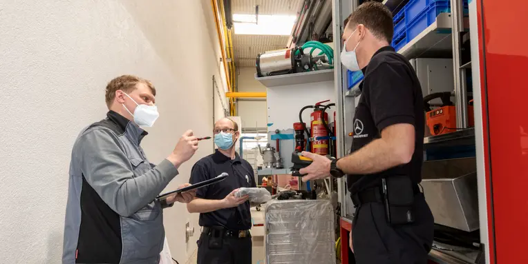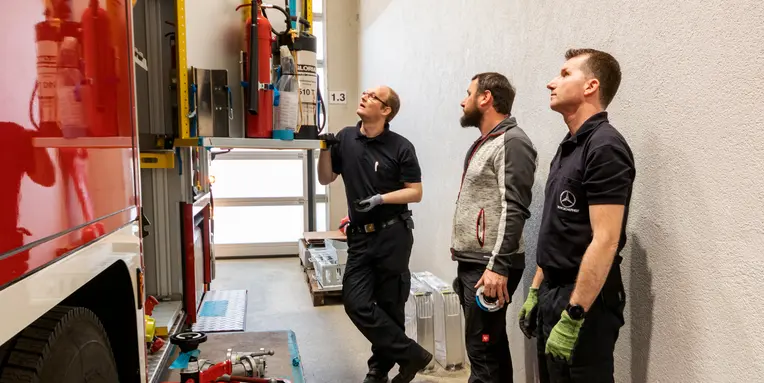 The close involvement of customers in the production process is unavoidable with custom-made products such as this. As the team is relying on their vehicle in cases of emergency, the fire brigade’s constant feedback on the design and details of their truck is key. Therefore, before the final touches are applied, a shell construction meeting takes place at EMPL. The body experts present all the features of the Econic and, together with the plant fire brigade, make some more adjustments to the plans.
