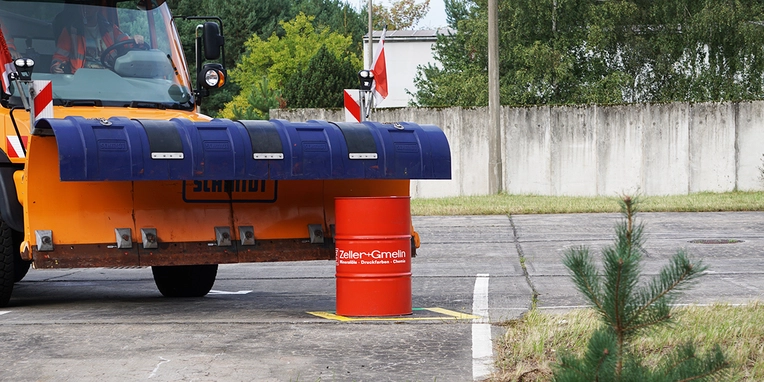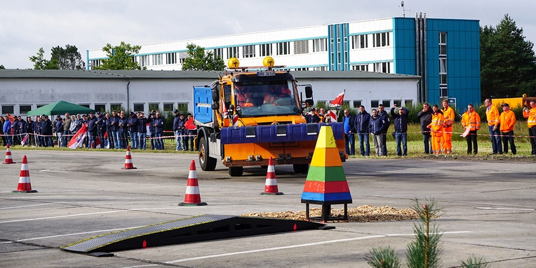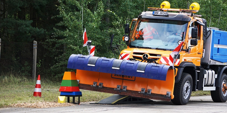 No, there wasn’t any snow in Stolpe in Brandenburg when the German snow ploughing championships were held at the beginning of September, but the course on a site belonging Brandenburg state’s highways authority presented a pretty tough challenge all the same: completing slaloms both forwards and in reverse gear, accurately moving obstacles to target locations and clearing stacked pyramids with precision.