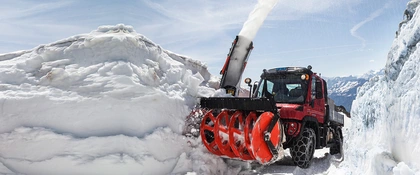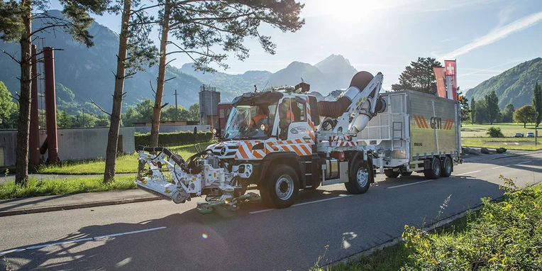 A Unimog U 530 is the ideal vehicle for maintaining Switzerland's national highways – whether mowing the verges in summer or snow-clearing in winter.