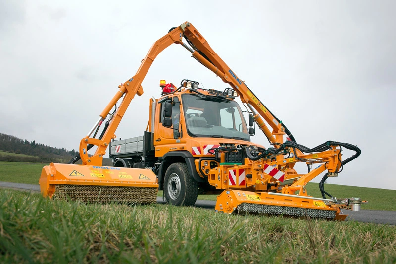 The new Unimog implement carriers are equipped for vegetation maintenance and snow-clearing: whether it's snow-clearing, spreading gritting salt to combat ice or maintaining the roadside vegetation – the task here is to mow, cut and chop grass, plants, bushes and trees on either side of the crash barriers as well as around the reflector posts.