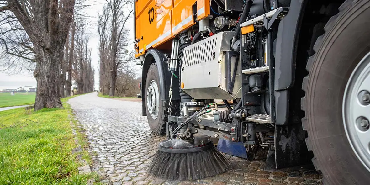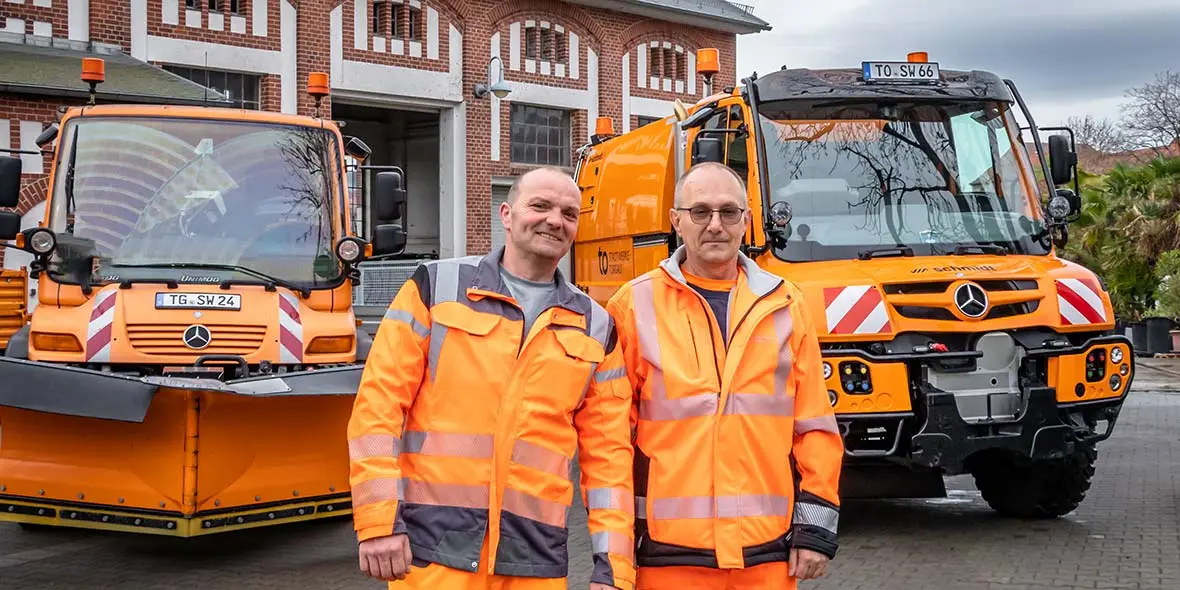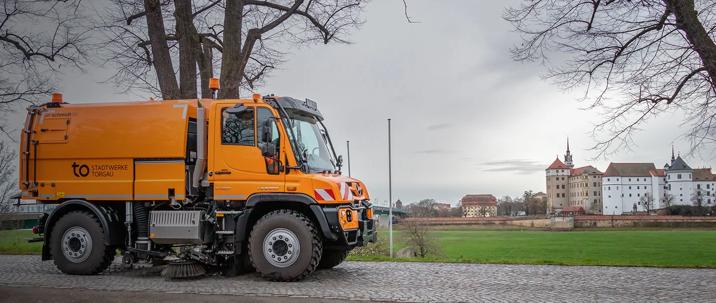 Torgau, a town in Saxony with 20,000 inhabitants. The world is still good here. Two men make a significant contribution to this: Jens Riedel and Silvio Schubert. Their job is to keep the city streets clean. Their fleet consists of three Unimog vehicles: a U 300, a U 400 and a brand-new U 427 – with deep orange paintwork (RAL 2011).