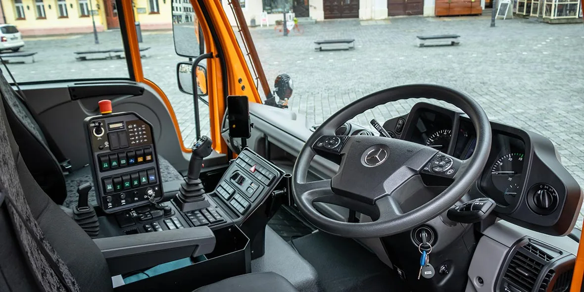 The U 400 already has ten years behind it. Therefore, it is only used as a sweeper when required. The municipal utility company mainly uses it for winter service. All three Unimog vehicles are equipped with a Bucher plough and grit bin. Seat heating, mirror heating, windscreen heating, surround lighting, rotating beacons – these features are indispensable for the Unimog workplace in winter.