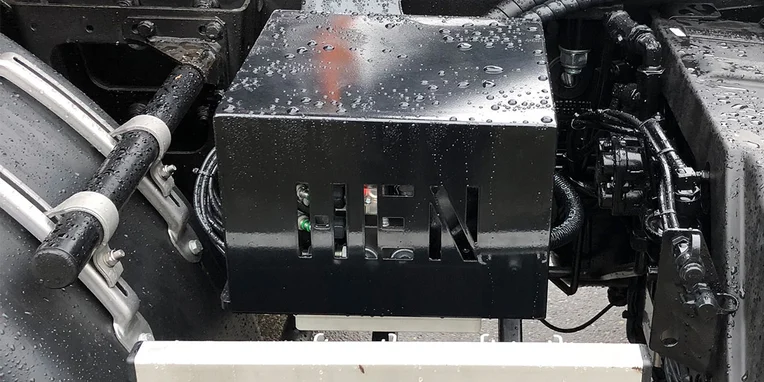 The roll-off system developed by HEN are firmly bolted to the frame of the Unimog in accordance with the bodywork guidelines. To convert the Unimog with a steel dump box for plant material for winter service use, the roller frame with, say, a spreader attached, is simply hauled on using a single-arm lifting mechanism.