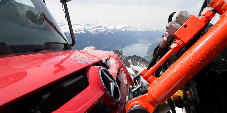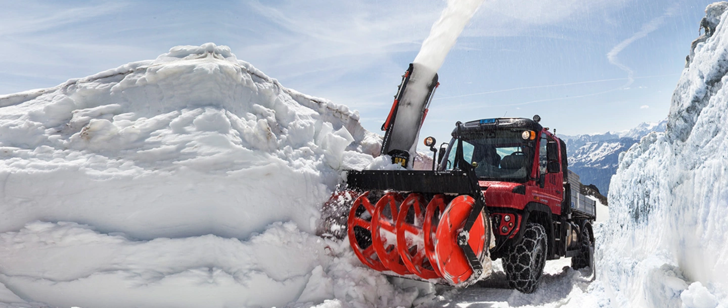 Metre for metre, the Unimog U 430 works its way forward,with 220 kWof sheer power! The rotary snow plough mounted at the front cuts through the glistening white top edge of the snow. From the ejection chute the snow flies in a high arc and splatters onto the steep slope a few metres further down.Way down in the valley Lake Brienz sparkles in the morning sun, against the majestic backdrop of the Bernese Alps with the famous trio of Eiger, Mönch and Jungfrau. This is a spectacle Frank Zobrist has no time to enjoy. Hismission is to clear the tracks of the Brienz Rothorn railway below the upper station still covered in deep snow even at the end of May.