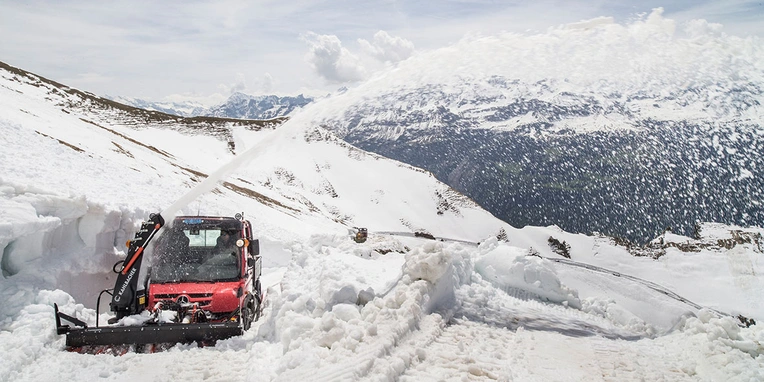 For this reason, it is always time to clear the snow frommid-May. “A team of five usually handles that task,” says Daniel Schlosser: Two railway employees use hand-held snow ploughs to remove the snowy peaks. A third colleague uses a PistenBully (ski-slope maintenance vehicle) to clear a first rough track. Colleague number four clears rocks away. Colleague number five – Frank Zobrist, who heads the clearance crew – then uses the Unimog to clear the bulk of the snow.