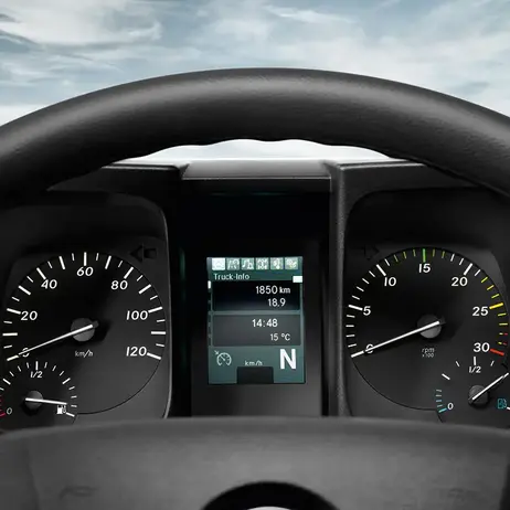The cab is clearly organised and creates a pleasant working atmosphere. The multifunction steering wheel fits perfectly in your hand and provides quick access to the hands-free system and the display of the instrument cluster.