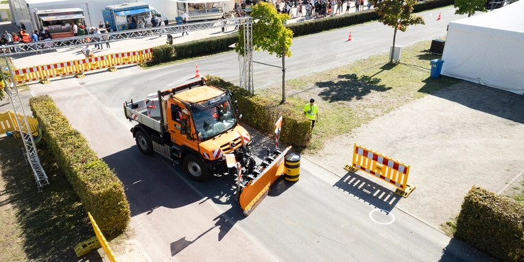 The basis: a Mercedes-Benz Unimog implement carrier with a snow plough. The competition takes place on a set course that replicates typical operating situations. Kerbs, narrow passages, obstacles – every move counts here. And every centimetre.