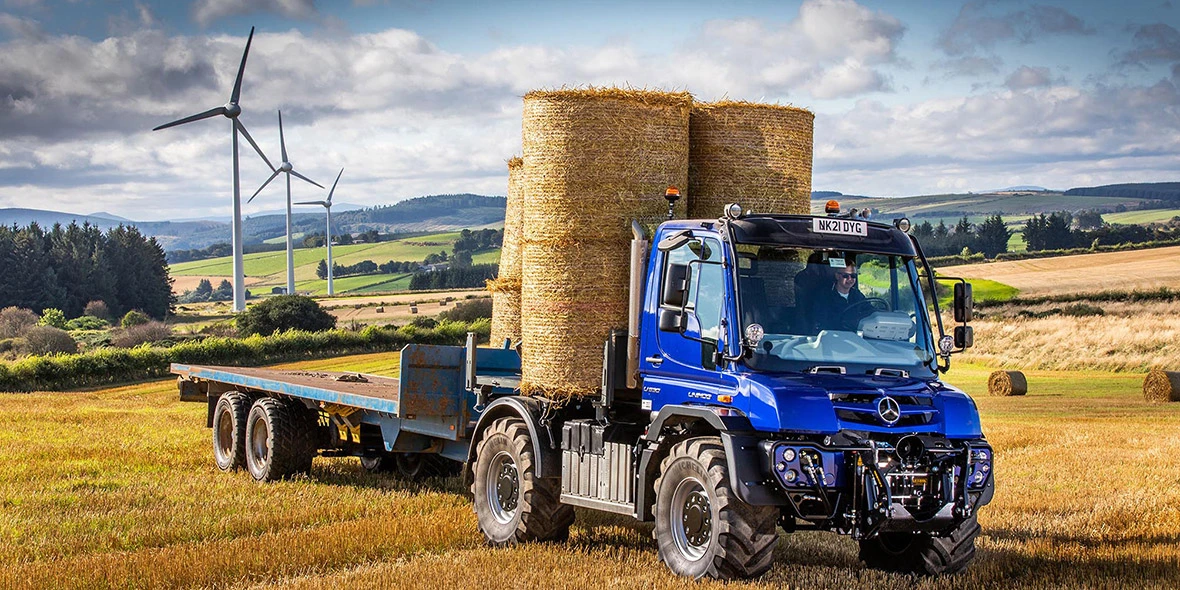 Grandes ruedas recorren un campo cercano a la localidad escocesa de Banff, a unas 45 millas al norte de Aberdeen. A pesar de su imponente tamaño, se deslizan con suavidad por el suelo agrícola. Y desplazan por el campo a un Unimog U 530 color azul noche de verano. Gracias a los neumáticos agrícolas más grandes permitidos del tipo Michelin 495/70 R24, este todoterreno posee la máxima tracción. Al mismo tiempo, la baja presión de los neumáticos protege el delicado suelo de cultivo: la tecnología CTI (Central Tyre Inflation) lo hace posible.