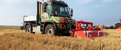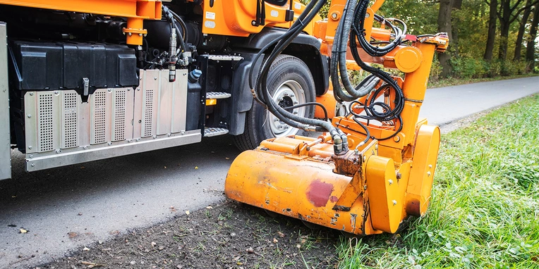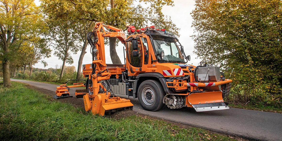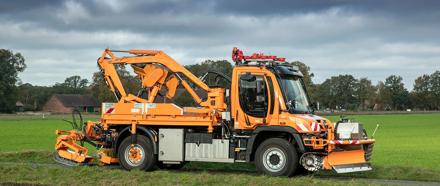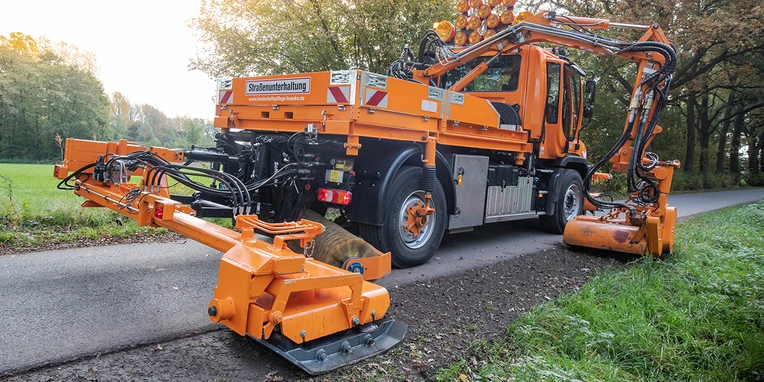 Mantenimiento regular de arcenes con el Unimog a prueba de acumulaciones de agua.