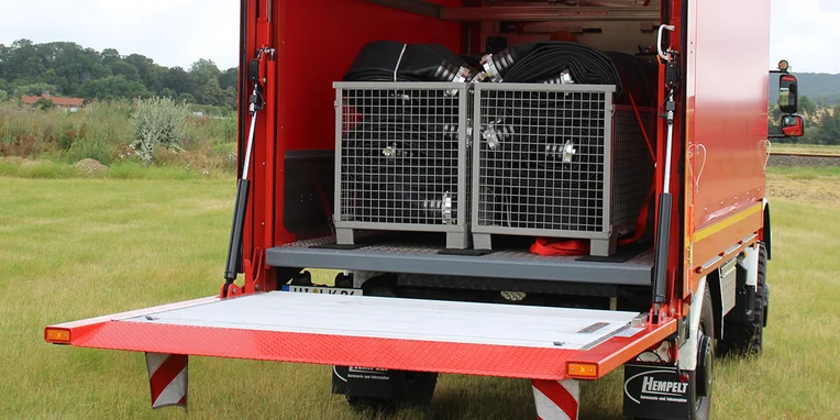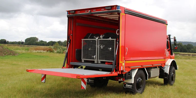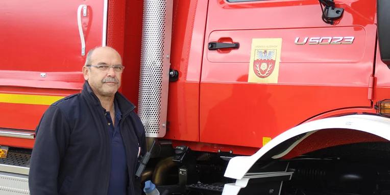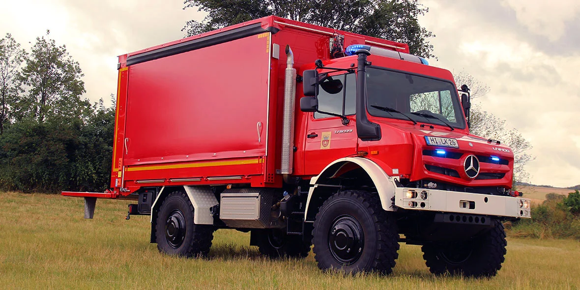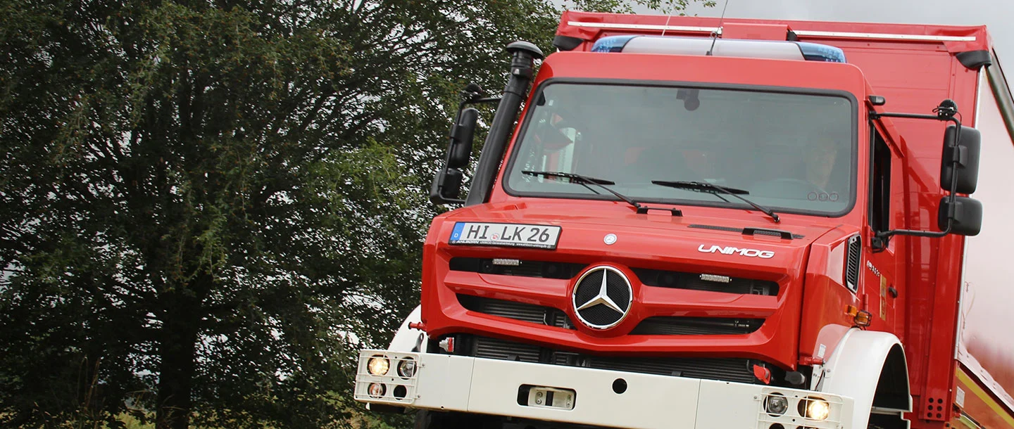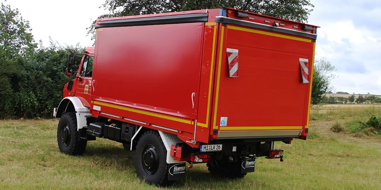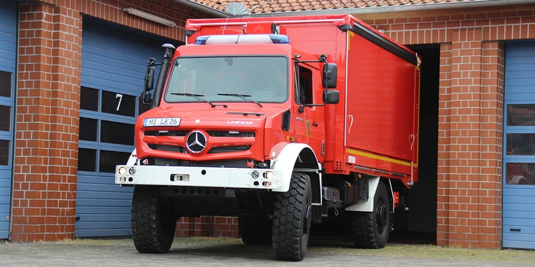 En colaboración con el representante general de Unimog Ahlborn, que también se encuentra en Hildesheim, el cuerpo de bomberos ha equipado un Unimog exactamente a su gusto: un Unimog de alta movilidad U 5023 de 230 CV. El vehículo con una superestructura de la firma Hempelt de Meißen cumple los requisitos y la normativa para GW Logistik 2 (vehículos logísticos para transporte de equipos). El todoterreno rojo fuego está estacionado en la central técnica del cuerpo de bomberos (FTZ) del distrito de Hildesheim, en Groß Düngen.