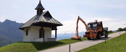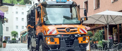 Además de un Mercedes-Benz Atego y un vehículo multifunción más pequeño, el U 427 reequipado también sale a la carretera en caso de hielo y nieve. En la superficie de carga se encuentra también el flamante depósito esparcidor Schmidt «Stratos B20» con mezclador de sal húmeda. El depósito tiene capacidad para dos metros cúbicos de sal de deshielo.