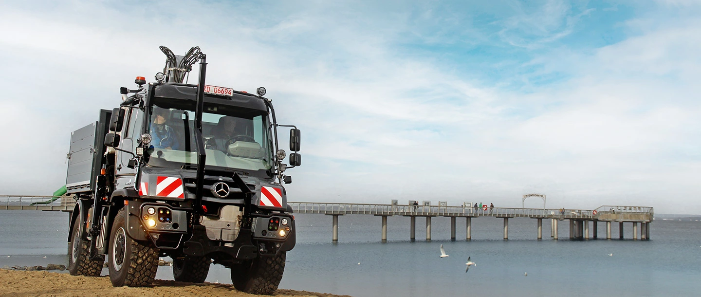 Cada año, los hombres del patio de construcción cargan una media de 100 metros cúbicos de residuos en la playa. El brazo Atlas revisado está controlado por radiotelemando y ya ha prestado su servicio de forma fiable en el último Unimog. Cuchara cribadora, cuchara perforadora, cuchara para hierba marina: hay un accesorio adecuado para cada aplicación. Para avanzar de forma óptima por la playa de arena, el Unimog de 272 CV de potencia se equipó con el sistema de regulación de la presión de los neumáticos TireControl plus disponible de fábrica.